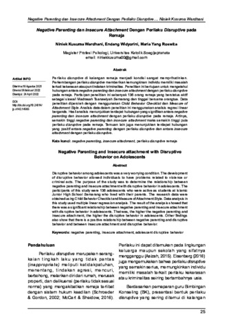 Perilaku disruptive di kalangan remaja menjadi kondisi sangat memprihatinkan. Perkembangan perilaku disruptive memberikan kemungkinan individu memiliki masalah terkait kekerasan ataupun tindakan kriminalitas. Penelitian ini bertujuan untuk mengetahui hubungan antara negative parenting dan insecure attachment dengan perilaku disruptive pada remaja. Partisipan penelitian ini sebanyak 136 orang remaja yang berstatus aktif sebagai siswa/i Madrasah Tsanawiyah Semarang dan tinggal bersama orangtua. Data penelitian diperoleh dengan menggunakan Child Behavior Checklist dan Measure of Attachment Style. Analisis data dalam penelitian ini menggunakan analisis regresi linear berganda. Hasil analisis menunjukkan terdapat hubungan yang signifikan antara negative parenting dan insecure attachment dengan perilaku disruptive pada remaja. Artinya, semakin tinggi negative parenting dan insecure attachment maka semakin tinggi pula perilaku disruptive pada remaja. Temuan lain juga menunjukkan terdapat hubungan yang positif antara negative parenting dengan perilaku disruptive dan antara insecure attachment dengan perilaku disruptive