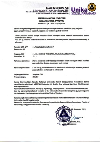 Febe, Tirza and Widyorini, Endang "Peran perceived control sebagai mediator dalam hubungan antara parental overprotection dengan kecemasan pada remaja". Psikostudia. (Unpublished)