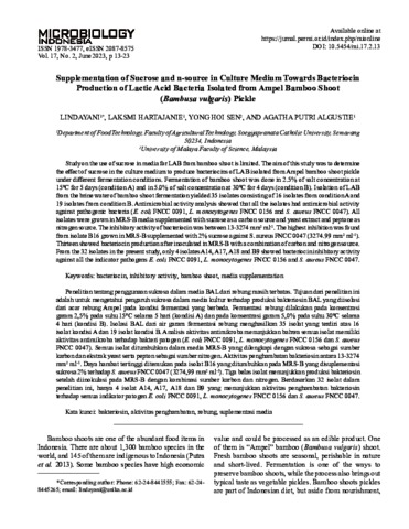 LINDAYANI, LINDAYANI and HARTAJANIE, LAKSMI and SEN, YONG HOI and ALGUSTIE, AGATHA PUTRI (2023) Supplementation of Sucrose and n-source in Culture Medium Towards Bacteriocin Production of Lactic Acid Bacteria Isolated from Ampel Bamboo Shoot (Bambusa vulgaris) Pickle. Microbiology Indonesia, 17 (2). pp. 13-23. ISSN 1978-3477