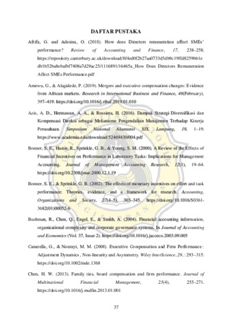 Tujuan dari peneliian ini adalah untuk mengetahui hubungan dari kompensasi direksi yang diberikan kepada manajemen terhadap kinerja perusahaan yang dimoderasi oleh strategi diversifikasi geografi. Sampel yang didapat berjumlah 570 sampel yang berbentuk data panel. Sampel didapat dari seluruh emiten industri non-keuangan yang terdaftar di BEI pada periode 2015-2019. Dari 570 sampel yang didapat telah dilakukan split sample pada variabel kompensasi direksi yang bertujuan untuk mengelompokkan antara kompensasi besar dan kompensasi kecil. Pada penelitian ini kinerja perusahaan diproksi oleh ROA dan NPM. Hasil penelitian ini : 1) Pemberian kompensasi besar kepada direksi tidak memiliki hubungan kuadratik terhadap kinerja perusahaan. 2) Pemberian kompensasi kecil kepada direksi memiliki hubungan kuadratik terhadap kinerja perusahaan. 3) Strategi diversifikasi geografis tidak memoderasi hubungan antara kompensasi besar maupun kecil terhadap kinerja perusahaan