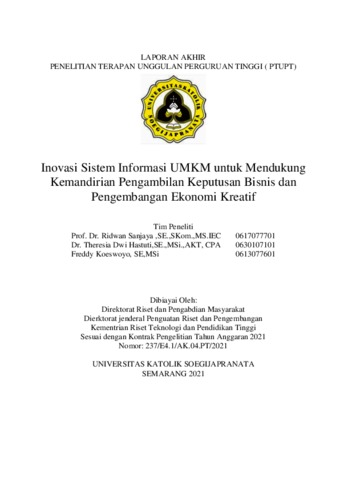 Ridwan, Sanjaya and Theresia Dwi Hastuti, Theresia and freddy koeswoyo, freddy Laporan Akhir Hibah Inovasi Sistem informasi UMKM untuk mendukung kemandirian pengambilan keputusan bisnis dan pengembangan ekonomi kreatif. Universitas Katolik Soegijapranata.