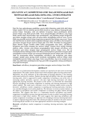 Alfares, Valentin C.F and Hernawati, Lucia and Eriany, Praharesti SELF-EFFICACY, KOMPETENSI GURU DALAM MENGAJAR DAN MOTIVASI BELAJAR PADA SISWA SMA: STUDI LITERATUR. SELF-EFFICACY, KOMPETENSI GURU DALAM MENGAJAR DAN MOTIVASI BELAJAR PADA SISWA SMA: STUDI LITERATUR.