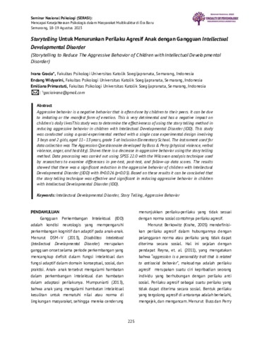 gracia, Ivana and Widyorini, Endang and PRIMASTUTI, EMILIANA Storytelling Untuk Menurunkan Perilaku Agresif Anak dengan Gangguan Intellectual Developmental Disorder. Seminar nasional psikologi (SERASI).