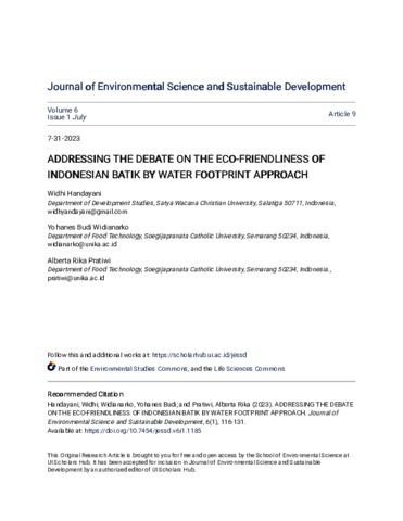 Handayani, Widhi and WIDIANARKO, BUDI and Pratiwi, Alberta Rika ADDRESSING THE DEBATE ON THE ECO-FRIENDLINESS OF ADDRESSING THE DEBATE ON THE ECO-FRIENDLINESS OF INDONESIAN BATIK BY WATER FOOTPRINT APPROACH. UNSPECIFIED.
