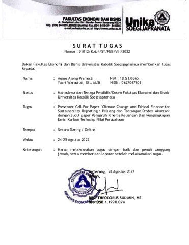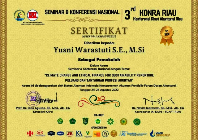 Agnes Ajeng Pramesti, Agnes and Yusni Warastuti, YW Konra: Pengaruh Kinerja Keuangan Dan Pengungkapan Emisi Karbon Terhadap Nilai Perusahaan. In: Seminar dan Konfrensi Nasional ke 3 “Climate Change and Ethical Finance for Sustainability Reporting: Peluang dan Tantangan Profesi Akuntan” . Riau. 24 – 25 Agustus 2022.