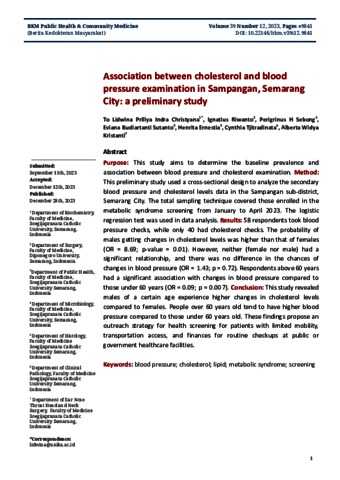 TO, LIDWINA PRILLYA INDRA CHRISTYANA (2023) Association between cholesterol and blood pressure examination in Sampangan, Semarang City: a preliminary study. Association between cholesterol and blood pressure examination in Sampangan, Semarang City: a preliminary study.