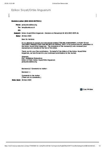 HARTONO, HENY and MURNIATI, CECILIA TITIEK LOA ONLINE ASSESSMENT: A STUDY OF ELT TEACHERS’ PERSPECTIVES AND BELIEFS IN CENTRAL JAVA. Ezikov Svyat/Orbis Linguarum, 21 (3). ISSN 7-15 (In Press)