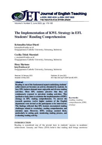 Diasti, Krismalita and MURNIATI, CECILIA TITIEK and HARTONO, HENY The Implementation of KWL Strategy in EFL Students’ Reading Comprehension. Journal of English Teaching, 9 (2). ISSN 2622-4224