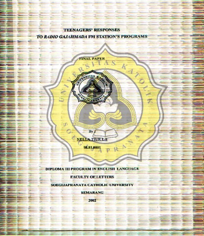TIUR L.S, NELLA (2002) TEENAGERS' RESPONSES TO RADIO GAJAHMADA FM STATION'S PROGRAMS. Diploma thesis, UNIVERSITAS KATOLIK SOEGIJAPRANATA.