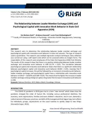 Ratri, Via Mutiara and Haryanti, Kristiana The Relationship between Leader Member Exchange (LMX) and Psychological Capital with Innovative Work Behavior in State Civil Apparatus (ASN). Asian Journal of Engineering, Social and Health.