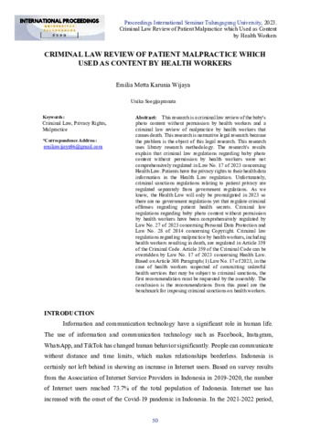 WIJAYA, EMILIA METTA KARUNIA Prosiding_CRIMINAL LAW REVIEW OF PATIENT MALPRACTICE WHICH USED AS CONTENT BY HEALTH WORKERS. In: Building the Better Future in the Digitalization Era.
