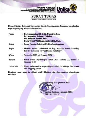 Utami, Margaretha Sih Setija and SULASTRI, AUGUSTINA and Santoso, Justinus Budi and Suryani, Angela Oktavia and GOERITNO, HARYO and WIDHIANINGTANTI, L. TRISNI and Luijtelaar, Gilles van [BUKTI KORESPONDENSI] ADAPTATION OF REY AUDITORY VERBAL LEARNING TEST FOR INDONESIA: ITS VALIDITY AND RELIABILITY. Agencja Wydawnicza MEDSPORTPRESS.