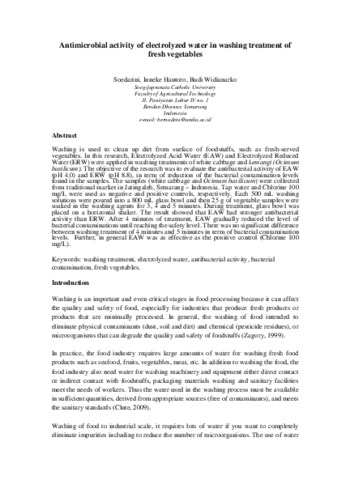 Soedarini, Bernadeta and HANTORO, INNEKE and WIDIANARKO, BUDI Antimicrobial activity of electrolyzed water in washing treatment of fresh vegetables. In: International Food Conference 2016.