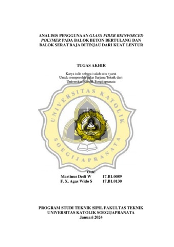 WICAKSONO, MARTINUS DEDI and SAPUTRO, FRANCISCUS XAVERIUS AGAS WIDO (2024) ANALISIS PENGGUNAAN GLASS FIBER REINFORCED POLYMER PADA BALOK BETON BERTULANG DAN BALOK SERAT BAJA DITINJAU DARI KUAT LENTUR. Skripsi thesis, Universitas Katolik Soegijapranata Semarang.