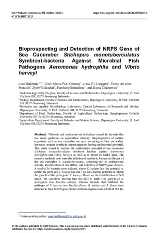 Budiharjo, Anto and Girsang, Cindy Maria Putri and Lunggani, Arina Tri and Mardiah, Fanny Amalina and Wulandari, Dyah and Sulardiono, Bambang and Chilmawati, Diana Bioprospecting and Detection of NRPS Gene of Sea Cucumber Stichopus monotuberculatus Symbiont-bacteria Against Microbial Fish Pathogens Aeromonas hydrophila and Vibrio harveyi. In: 4 th ICMMBT 2023.