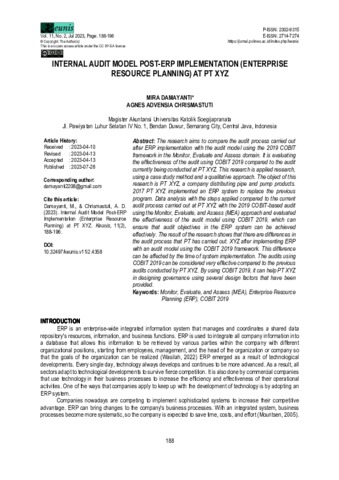 DAMAYANTI, MIRA and CHRISMASTUTI, AGNES ADVENSIA Internal Audit Model Post-Erp Implementation (Enterprise Resource Planning) at Pt XYZ. Keunis : Journal Finance and Business. ISSN 2714-7274
