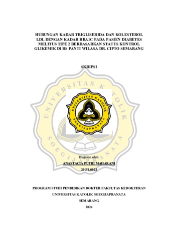 MAHARANI, ANASTACIA PUTRI (2024) HUBUNGAN KADAR TRIGLISERIDA DAN KOLESTEROL LDL DENGAN KADAR HBA1C PADA PASIEN DIABETES MELITUS TIPE 2 BERDASARKAN STATUS KONTROL GLIKEMIK DI RS PANTI WILASA DR. CIPTO SEMARANG. Skripsi thesis, UNIVERSITAS KATOLIK SOEGIJAPRANATA.