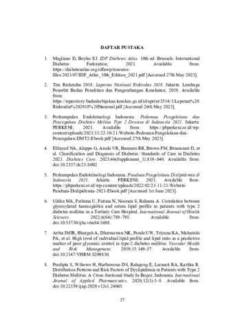 ABSTRAK Latar Belakang: Data Riskesdas tahun 2018, menunjukan bahwa terjadi peningkatan prevalensi DM dari 6,9% pada tahun 2013 menjadi 8,5% di tahun 2018. Pasien DM tipe 2 rentan terhadap dislipidemia. Kontrol profil lipid dan kontrol glikemik yang optimal menjadi faktor penting dalam pencegahan komplikasi kardiovaskular. Meningkatnya jumlah penderita DM dan risiko komplikasi kardiovaskular akibat kontrol lipid dan glikemik yang buruk, serta pada penelitian-penelitian sebelumnya ditemukan hasil yang bertentangan dan belum konsisten. Tujuan: Penelitian ini bertujuan untuk mengetahui hubungan kadar trigliserida dan kolesterol LDL dengan kadar HbA1c pada pasien DM tipe 2 berdasarkan status kontrol glikemik di RS Panti Wilasa Dr. Cipto Semarang. Metode: Penelitian cross sectional ini dilakukan di RS Panti Wilasa Dr. Cipto Semarang dan sebanyak 63 pasien DM tipe 2 menjadi sampel penelitian. Sumber data yang digunakan adalah data rekam medis pasien yang berobat pada tahun 2018-2023. Analisis data menggunakan uji komparatif Mann Whitney U. Hasil Penelitian: Didapatkan ada hubungan kadar TG dengan kadar HbA1c pada pasien DM tipe 2 berdasarkan status kontrol glikemik di RS Panti Wilasa Dr. Cipto Semarang. Kadar TG lebih tinggi secara signifikan (p=0,009) pada status kontrol glikemik baik dibandingkan buruk. Tidak ada hubungan bermakna kadar K-LDL dengan kadar HbA1c pada pasien DM tipe 2 berdasarkan status kontrol glikemik di RS Panti Wilasa Dr. Cipto Semarang (p=0,397). Kesimpulan: Kadar TG berhubungan dengan kadar HbA1c tetapi tidak ditemukan hubungan kadar K-LDL dengan kadar HbA1c. Kata Kunci: DM tipe 2, TG, K-LDL, HbA1c, dan kontrol glikemik.