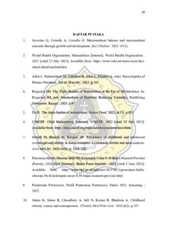 ABSTRAK Latar Belakang : Nutrisi optimal yang diberikan selama masa pertumbuhan menghasilkan pertumbuhan normal pada anak, sedangkan anak dengan riwayat pemberian nutrisi tidak adekuat akan rentan mengalami kondisi malnutrisi. Kondisi kelebihan atau kekurangan nutrisi disebut sebagai malnutrisi. Keadaan malnutrisi pada anak dikategorikan menjadi Undernutrition (Stunting, Wasting and Undernutrition), Hidden Hunger (Micronutrient Deficiensies), serta Overnutrition (Overweight and Obesity). Tujuan : Tujuan dari penelitian ini untuk mengetahui hubungan antara masukan antara masukan kalori harian dengan status gizi pada anak pra-sekolah di Puskesmas Purwoyoso Semarang. Metode : Penelitian ini merupakan penelitian analitik observasional dengan desain penelitian cross-sectional. Penelitian dilakukan pada bulan November-Desember 2023 di Puskesmas Purwoyoso pada anak pra-sekolah (usia 2-5 tahun). Data menggunakan masukan kalori harian dan status gizi. Analisis bivariat untuk mengetahui hubungan antara kalori harian dengan status gizi menggunakan uji korelasi Gamma Hasil : Hasil dari penelitian terhadap 48 anak usia pra-sekolah di Puskesmas Purwoyoso Semarang adalah sebagian besar anak memiliki status gizi baik (87,5%) dan rata-rata jumlah masukan kalori harian kurang (72,9%). Analisis bivariat menggunakan uji korelasi Gamma menunjukkan bahwa tidak terdapat hubungan antara masukan kalori harian dengan status gizi anak pra-sekolah di Puskesmas Purwoyoso Semarang (p value=0,673). Kesimpulan : Tidak terdapat hubungan antara masukan kalori harian dengan status gizi pada anak pra-sekolah di Puskesmas Purwoyoso Semarang. Kata Kunci : Masukan kalori harian, Status gizi, Anak pra-sekolah