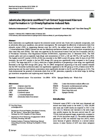 Ardanareswari, Katharina and Lowisia, Webiana and Soedarini, Bernadeta and Liao, Jiunn-Wang and Chung, Yun-Chin Jaboticaba (Myrciaria cauliflora) Fruit Extract Suppressed Aberrant Crypt Formation in 1,2-Dimetylhydrazine-Induced Rats. Plant Foods for Human Nutrition.