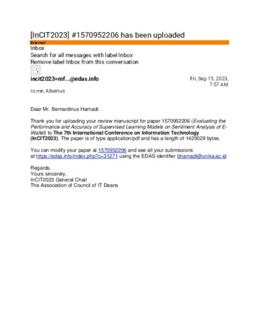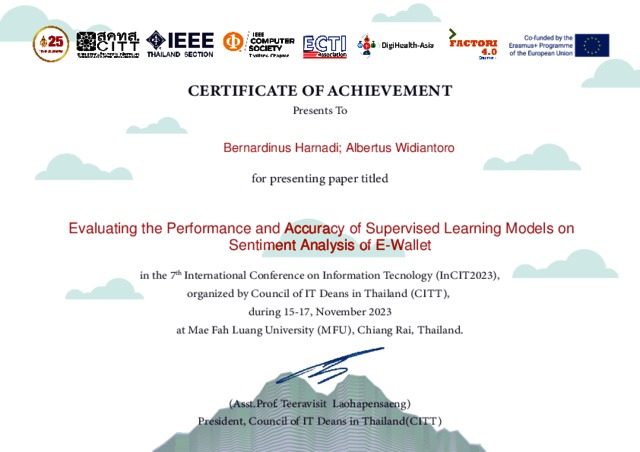 Harnadi, Bernardinus and Widiantoro, Albertus Dwiyoga (!EEE 2023) Evaluating the Performance and Accuracy of Supervised Learning Models on Sentiment Analysis of E-Wallet. IEEE Explore.