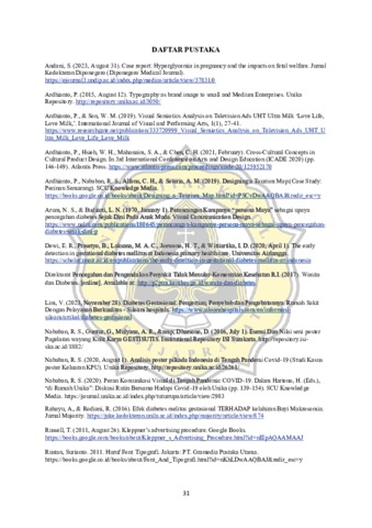ABSTRAK Diabetes merupakan permasalahan yang dihadapi sesorang karena kurangnya insulin ditubuh. Diabetes gestasional merupakan diabetes yang muncul akibat perubahaan hormon ketika kondisi sedang hamil. Permasalahan diabetes membuat dapatnya muncul penyakit penyakit lain karean tidak tertangani dengan baik. Di Indonesia sendiri yang merupakan salah satu negara dengan pengidap penyakit diabetes terbanyak di ASEAN. Menurut data Lancet pada 2011, sebanyak 3 juta bayi lahir mati setiap tahunnya akibat diabetes gestasional, dan juga membuat kehamilan dengan diabetes gestasional menyebabkan kemungkinan ibu meninggal 4 kali lipat. Walaupun berbahaya sangat disayangkan karena masih minimnya pengetahuan mengenai diabetes gestasional pada ibu hamil. Melihat ini juga membuat permasalahan diabetes makin meningkat yang terkena. Maka melihat begitu besarnya permasalahan diracangalah kampanye sosial ini diharapkan dapat ibu-ibu hamuk dapat mempersiapkan diri pada diabetes gestasional. kunci : komunikasi visual, kampanye, diabetes gestasional, ibu hamil.
