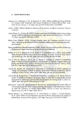 ABSTRAK Daging ayam segar memerlukan proses pengemasan dan penyimpanan agar kualitas nya terjamin ketika dikonsumsi. Tujuan dari penelitian ini adalah mengetahui pengaruh pengemasan hampa udara dan penyimpanan ditinjau dari sifat fisikokimiawi, mikrobiologis ayam rempah mentah juga pengaruhnya pada sifat fisikokimiawi dan sensoris ayam rempah matang. Sampel dikemas hampa udara dan disimpan pada suhu 4°C selama 0, 24, 48 , 72 dan 96 jam. Ayam rempah mentah diuji hardness, kadar air, kadar lemak, kadar protein, TVBN dan TPC. Ayam rempah matang diuji hardness, kadar air, kadar lemak, kadar protein, sensoris rating dan sensoris ranking. Selama penyimpanan, nilai hardness ayam rempah mentah menurun, sedangkan nilai hardness ayam rempah matang meningkat.Nilai TVBN ayam rempah mentah bumbu 96 jam <25 mg N/ 100 g yakni 16,72 ± 0,91 mg N/100 g. Penyimpanan ayam rempah mentah bumbu memberikan pengaruh signifikan pada kadar air, lemak, protein dan TPC ayam rempah matang bumbu. Nilai TPC ayam rempah bumbu 96 jam melebihi batasan 7 log CFU/g. Skala hedonik uji rating menurun seiring dengan penyimpanan. Ayam rempah matang bumbu 0 jam memiliki nilai TPC dan TVBN minim paling disukai panelis. Kata kunci : ayam rempah, pengemasan, penyimpanan, sifat fisikokimiawi, sifat mikrobiologis, sifat sensoris