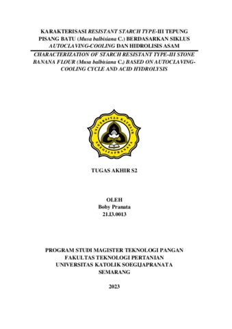 PRANATA, BOBY (2023) KARAKTERISASI RESISTANT STARCH TYPE-III TEPUNG PISANG BATU (MUSA BALBISIANA C.) BERDASARKAN SIKLUS AUTOCLAVING-COOLING DAN HIDROLISIS ASAM. Masters thesis, UNIVERSITAS KATOLIK SOEGIJAPRANATA.