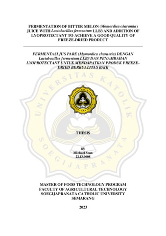 SEAN, MICHAEL (2023) FERMENTASI JUS PARE (MOMORDICA CHARANTIA) DENGAN LACTOBACILLUS FERMENTUM LLB3 DAN PENAMBAHAN LYOPROTECTANT UNTUK MENDAPATKAN PRODUK FREEZEDRIED BERKUALITAS BAIK. Masters thesis, UNIVERSITAS KATOLIK SOEGIJAPRANATA.