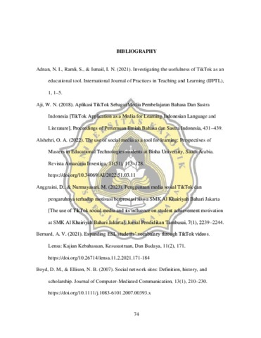 ABSTRAK Pertanyaan penelitian yang mendorong penelitian ini ada dua: pertama, untuk menyelidiki fitur sosial dan interaktif TikTok yang umum digunakan oleh siswa, dan kedua, untuk mengeksplorasi manfaat yang dirasakan dari mengintegrasikan TikTok sebagai alat pembelajaran untuk pengembangan Bahasa Inggris sebagai Bahasa Asing. Penelitian dilakukan terhadap mahasiswa dari 18 perguruan tinggi swasta dan negeri di Indonesia, menggunakan metode kuantitatif dengan menyebarkan kuesioner online kepada 101 responden. Temuan penelitian mengungkapkan bahwa pelajar secara umum memiliki pandangan positif terhadap TikTok sebagai platform untuk meningkatkan kemampuan bahasa Inggris mereka. Hal ini diakui tidak hanya sebagai media yang menghibur tetapi juga sebagai alat yang berharga untuk pembelajaran bahasa, menyediakan fitur sosial 'Hashtag dan Tantangan' dan fitur interaktif 'Temukan dan Jelajahi' yang memungkinkan siswa untuk menyesuaikan pencarian mereka, sehingga mendorong keterlibatan aktif. Dengan ini TikTok bermanfaat untuk meningkatkan keterampilan mendengarkan, berbicara, dan membaca, meningkatkan motivasi belajar siswa, membangun komunitas belajar, dan mengeksplorasi konten. Semua ini yang menekankan pentingnya platform ini dalam pembelajaran bahasa dalam era digital saat ini.