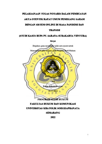 KUSUMANINGTYAS, BUNGA (2024) PELAKSANAAN TUGAS NOTARIS DALAM PEMBUATAN AKTA OTENTIK RAPAT UMUM PEMEGANG SAHAM DENGAN SISTEM ONLINE DI MASA PANDEMI DAN TRANSISI (STUDI KASUS RUPS PT. SARANA SURAKARTA VENTURA). Skripsi thesis, UNIVERSITAS KATOLIK SOEGIJAPRANATA.