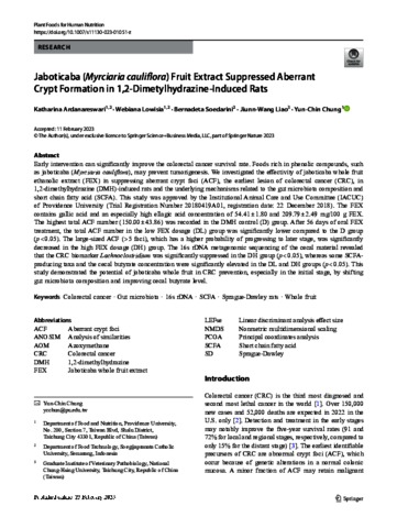 Ardanareswari, Katharina Jaboticaba (Myrciaria cauliflora) Fruit Extract Suppressed Aberrant Crypt Formation in 1,2-Dimetylhydrazine-Induced Rats". Jaboticaba (Myrciaria cauliflora) Fruit Extract Suppressed Aberrant Crypt Formation in 1,2-Dimetylhydrazine-Induced Rats".
