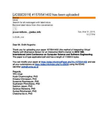 Harnadi, Bernardinus (IEEE 2019) The Method of Integrating Virtual Reality with Brainwave Sensor for an Interactive Math's Game. 2019 16th International Joint Conference on Computer Science and Software Engineering (JCSSE). ISSN 978-1-7281-0719-6