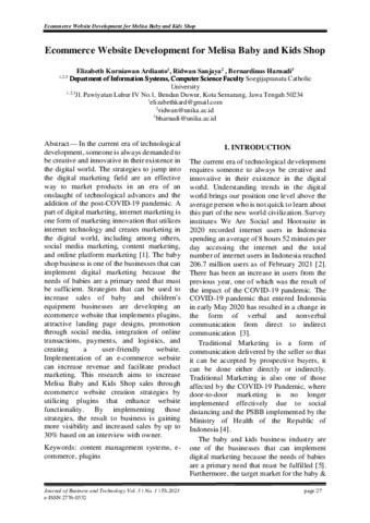 Harnadi, Bernardinus (JBT 3-1/2023) Ecommerce Website Development for Melisa Baby and Kids Shop. Journal of Business and Technology, 3 (1). ISSN 2776-0332