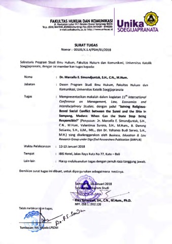 Simandjuntak, Marcella Elwina and Suroto, Valentinus and Setianto, Benny Danang and SARWO, YOHANES BUDI (2018) Solving Religious-Based Social Conflict between the Sunni and the Shia in Sampang, Madura: When Can the State Stop Being Responsible? In: 11th International Conference on Management, Law, Economics and Interdisciplinary Studies (MLEIS-18), 11-12 January 2018, Bali, Indonesia.