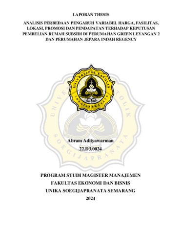 ADITYAWARMAN, ABRAM (2024) ANALISIS PERBEDAAN PENGARUH VARIABEL HARGA, FASILITAS, LOKASI, PROMOSI DAN PENDAPATAN TERHADAP KEPUTUSAN PEMBELIAN RUMAH SUBSIDI DI PERUMAHAN GREEN LEYANGAN 2 DAN PERUMAHAN JEPARA INDAH REGENCY. Masters thesis, UNIVERSITAS KATOLIK SOEGIJAPRANATA.