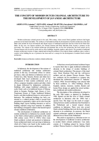 Ardiyanto, Antonius THE CONCEPT OF MODERN DUTCH COLONIAL ARCHITECTURE TO THE DEVELOPMENT OF JAVANESE ARCHITECTURE. Dimensi - Journal of Architecture And Built Environment. ISSN 2338-7858