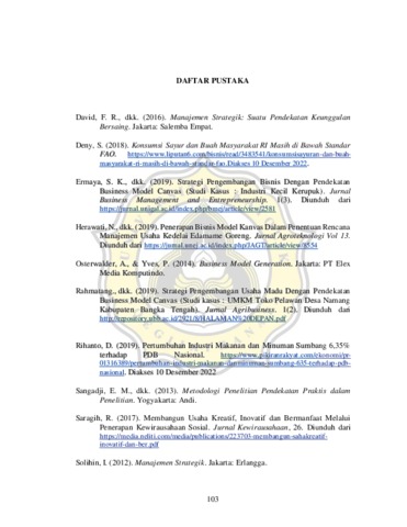 Perkembangan industri makanan dan minuman di Indonesia semakin bekembangan pesat. Pada penelitian kali ini objek penelitian yang dituju yaitu usaha Van Healthy Juice sebagai salah satu usaha kuliner yang ada di Indonesia. Persaingan yang semakin kuat dan ketat membuat usaha Nukusalad harus berpikir lebih keras agar dapat bertahan menghadapi pesaingan bisnis dengan menggunakan perumusan strategi yang tepat. Perumusan masalah pada penelitian ini adalah Bagaimana upaya strategi pengembangan usaha Van Healthy Juice dengan menggunakan Business Model Canvas. Tujuan penelitian ini untuk menentukan strategi pengembangan usaha Van Healthy Juice berdasarkan Business Model Canvas. Pengetahuan tentang lingkungan internal dan eksternal dari usaha ini merupakan sumber utama untuk merumuskan BMC. Metode pengumpulan data yang digunakan dalam penelitian ini yaitu wawancara dan ke pihak internal usaha. Alat analisis yang akan dipakai untuk mengolah data dari lapangan adalah Matriks Business Model Canvas. Dari hasil penelitian ini bahwa Usaha Van Healthy Juice telah memenuhi kesembilan elemen dari business model canvas. Namun, elemen bisnis di usaha Van Healthy Juice saat ini masih memiliki kelemahan sehingga perlu menciptakan strategi yang dihasilkan dari perbaikan business model canvas seperti sering mengadakan promo dan bonus, memaksimalkan pemasaran menggunakan media online, menambah investor sebagai tambahan modal usaha, melakukan inovasi produk dan packaging, memberi bonus bagi konsumen yang setia, menargetkan konsumen dari luar kota kudus, moderenisasi dan penambahan mesin produksi, melakukan cross promotion, menambah varian ukuran kemasan dan melakukan promosi iklan & endorsement. Kata Kunci : Business Model Canvas