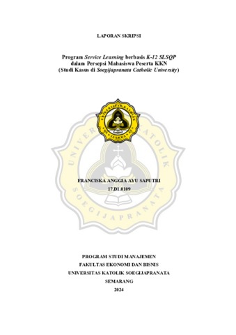 SAPUTRI, FRANCISKA ANGGIA AYU (2024) PROGRAM SERVICE LEARNING BERBASIS K-12 SLSQP DALAM PERSEPSI MAHASISWA PESERTA KKN (STUDI KASUS DI SOEGIJAPRANATA CATHOLIC UNIVERSITY). Skripsi thesis, UNIVERSITAS SOEGIJAPRANATA.