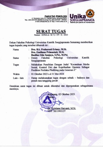 Eriany, Praharesti and PRIMASTUTI, EMILIANA and Sanjaya, Basilius Oda KEPRIBADIAN OPENESS, KONTROL DIRI DAN KECANDUAN MEDIA SOSIAL SEBAGAI PREDIKTOR PERILAKU PHUBBING PADA REMAJA. Project Report. Universitas Katolik Soegijapranata. (Unpublished)