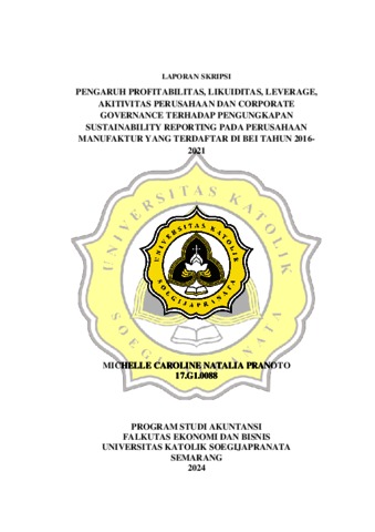 PRANOTO, MICHELLE CAROLINE NATALIA (2024) PENGARUH PROFITABILITAS, LIKUIDITAS, LEVERAGE, AKITIVITAS PERUSAHAAN DAN CORPORATE GOVERNANCE TERHADAP PENGUNGKAPAN SUSTAINABILITY REPORTING PADA PERUSAHAAN MANUFAKTUR YANG TERDAFTAR DI BEI TAHUN 20162021. S1 thesis, UNIVERSITAS KATOLIK SOEGIJAPRANATA.