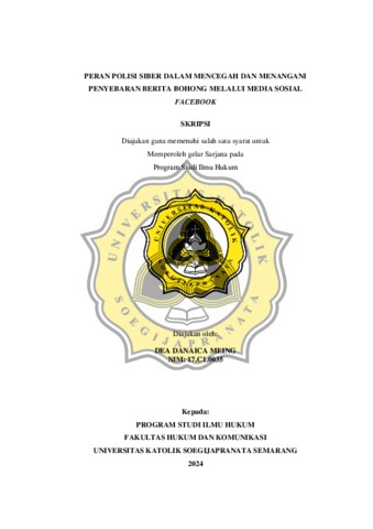 MEING, DEA DANAICA (2024) PERAN POLISI SIBER DALAM MENCEGAH DAN MENANGANI PENYEBARAN BERITA BOHONG MELALUI MEDIA SOSIAL FACEBOOK. S1 thesis, UNIVERSITAS KATOLIK SOEGIJAPRANATA.