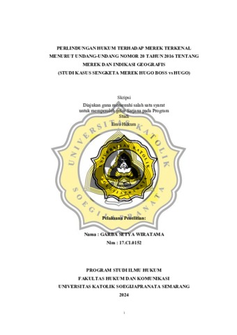 WIRATAMA, GARBA SETYA (2024) PERLINDUNGAN HUKUM TERHADAP MEREK TERKENAL MENURUT UNDANG-UNDANG NOMOR 20 TAHUN 2016 TENTANG MEREK DAN INDIKASI GEOGRAFIS (STUDI KASUS SENGKETA MEREK HUGO BOSS vs HUGO). S1 thesis, UNIVERSITAS KATOLIK SOEGIJAPRANATA.