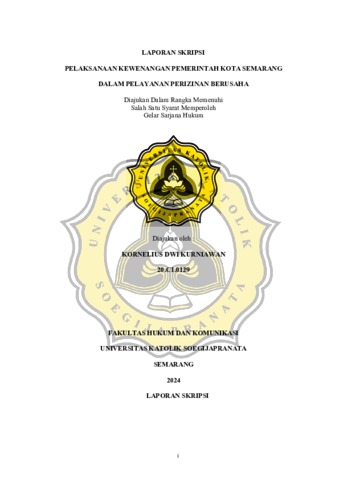 KURNIAWAN, KORNELIUS DWI (2024) PELAKSANAAN KEWENANGAN PEMERINTAH KOTA SEMARANG DALAM PELAYANAN PERIZINAN BERUSAHA. S1 thesis, UNIVERSITAS KATOLIK SOEGIJAPRANATA.
