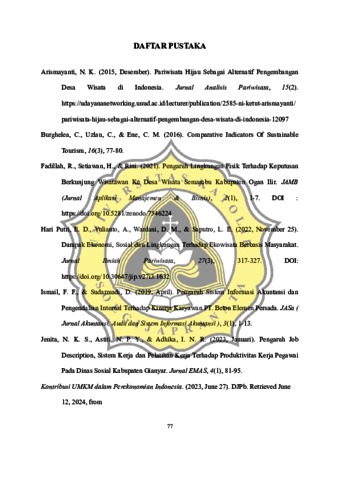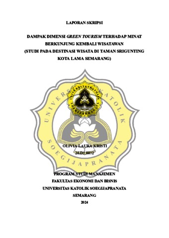 KRISTI, OLIVIA LAURA (2024) DAMPAK DIMENSI GREEN TOURISM TERHADAP MINAT BERKUNJUNG KEMBALI WISATAWAN (STUDI PADA DESTINASI WISATA DI TAMAN SRIGUNTING KOTA LAMA SEMARANG). S1 thesis, UNIVERSITAS KATOLIK SOEGIJAPRANATA.