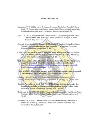 ABSTRAK Fenomena budaya Korea yang sedang populer di Indonesia yang biasa disebut dengan Korean Wave atau Hallyu ini menimbulkan minat dari khalayak. Berawal dari menonton hiburan Korea sebagai sarana hiburan hingga tertarik untuk membeli produkproduk yang digunakan pada tokoh favorite Korea mereka. Tujuan dari penelitian ini untuk mengetahui apakah terdapat perbedaan persepsi terhadap brand ambassador berdasarkan kepopuleran, daya tarik, kredibilitas, kekuatan. Penelitian ini adalah kuantitatif menggunakan uji independent sample t-test. Sampel pada penelitian ini 50 sampel yang mengetahui brand ambassador Song Joong Ki dan Lee Min Ho. Berdasarkan hasil pada penelitian ini tidak terdapat perbedaan signifikan dalam kepopuleran, daya tarik, kredibilitas dan kekuatan antara brand ambassador Song Joong Ki dan Lee Min Ho. The Korean cultural phenomenon that is currently popular in Indonesia, which is usually called the Korean Wave or Hallyu, is generating interest from the public. Starting from watching Korean entertainment as a means of entertainment to being interested in buying products used by their favorite Korean characters. The purpose of this research is to find out whether there are differences in perceptions of brand ambassadors based on popularity, attractiveness, credibility, strength. This research is quantitative using the independent sample t-test. The sample in this study was 50 samples who knew brand ambassadors Song Joong Ki and Lee Min Ho. Based on the results of this research, there is no significant difference in popularity, attractiveness, credibility and strength between brand ambassadors Song Joong Ki and Lee Min Ho.
