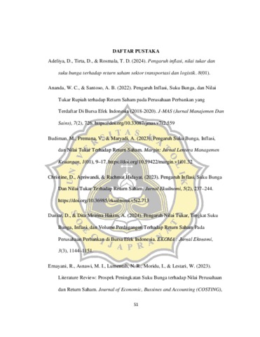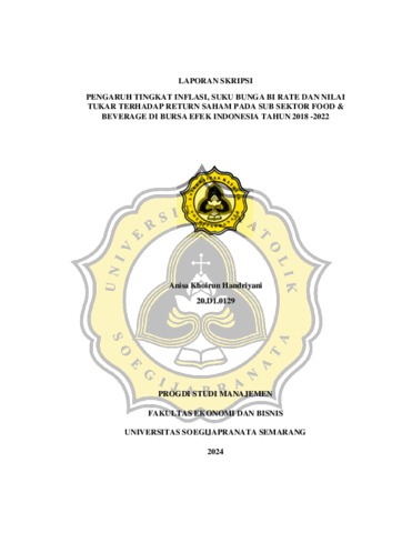 HANDRIYANI, ANISA KHOIRUN (2024) PENGARUH TINGKAT INFLASI, SUKU BUNGA BI RATE DAN NILAI TUKAR TERHADAP RETURN SAHAM PADA SUB SEKTOR FOOD & BEVERAGE DI BURSA EFEK INDONESIA TAHUN 2018 -2022. S1 thesis, UNIVERSITAS KATOLIK SOEGIJAPRANATA.