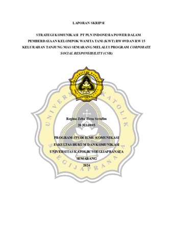 SERAFIM, REGINA ZEBA TIRZA (2024) STRATEGI KOMUNIKASI PT PLN INDONESIA POWER DALAM PEMBERDAYAAN KELOMPOK WANITA TANI (KWT) RW 09 DAN RW 15 KELURAHAN TANJUNG MAS SEMARANG MELALUI PROGRAM CORPORATE SOCIAL RESPONSIBILITY (CSR). S1 thesis, UNIVERSITAS KATOLIK SOEGIJAPRANATA.