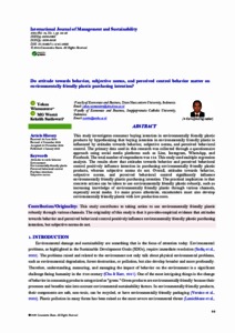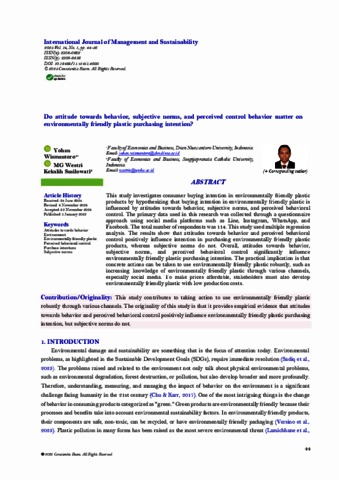 Wismantoro, Yohan and Susilowati, MG Westri Kekalih (2024) Do attitude towards behavior, subjective norms, and perceived control behavior matter on environmentally friendly plastic purchasing intention? International Journal of Management and Sustainability, 14 (1). pp. 44-56. ISSN 2306-9856