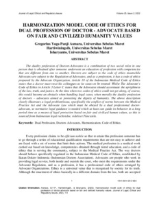 Asmara, Gregorius Yoga Panji and -, Hartiwiningsih and -, Isharyanto HARMONIZATION MODEL CODE OF ETHICS FOR DUAL PROFESSION OF DOCTOR - ADVOCATE BASED ON FAIR AND CIVILIZED HUMANITY VALUES. HARMONIZATION MODEL CODE OF ETHICS FOR DUAL PROFESSION OF DOCTOR - ADVOCATE BASED ON FAIR AND CIVILIZED HUMANITY VALUES.